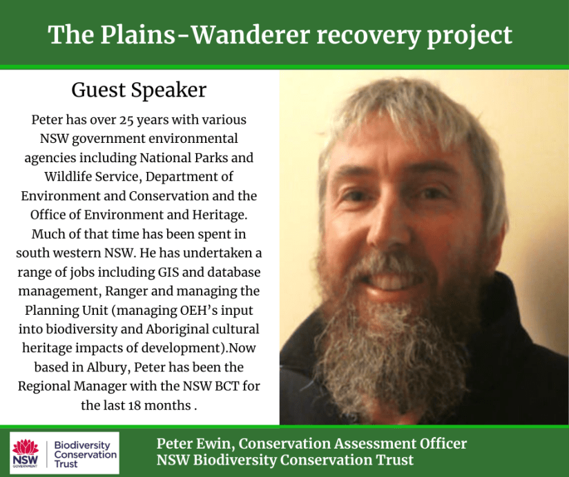Peter Ewin from NSW Biodiversity Trust, Albury, conducts conservation assessments for projects that can receive funding from that agency. He outlined opportunities for landholders to participate in the next round of tenders in the Plains-wanderer Incentive Project. This tender process is part of the NSW Government, Save our Species Project, and is in partnership with the Australian Government and National Landcare Program.