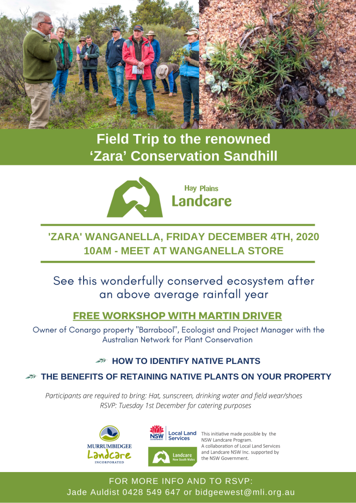 Hay Plains Landcare was delighted with the response to the Zara Conservation Sandhill Field Trip last week. In excess of 30 interested landholders and community members gathered at the Wanganella Store for registration and morning tea before undertaking the short drive to Zara to observe the unique landscape that has been protected from livestock grazing since 1994. The significance of the site was not lost on the wider community when members travelled from Hillston, Morundah, Jerilderie, Deniliquin and Hay to take part.