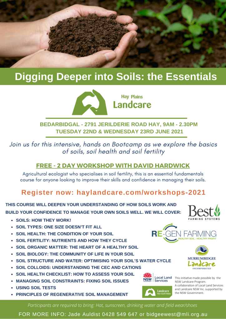 Hay Plains Landcare have been able to secure David Hardwick of, Soil Food Land, to deliver a one day course to help us understand that what we do on the surface of the land directly affects the biology in the soil and hence the vegetation growing in it.