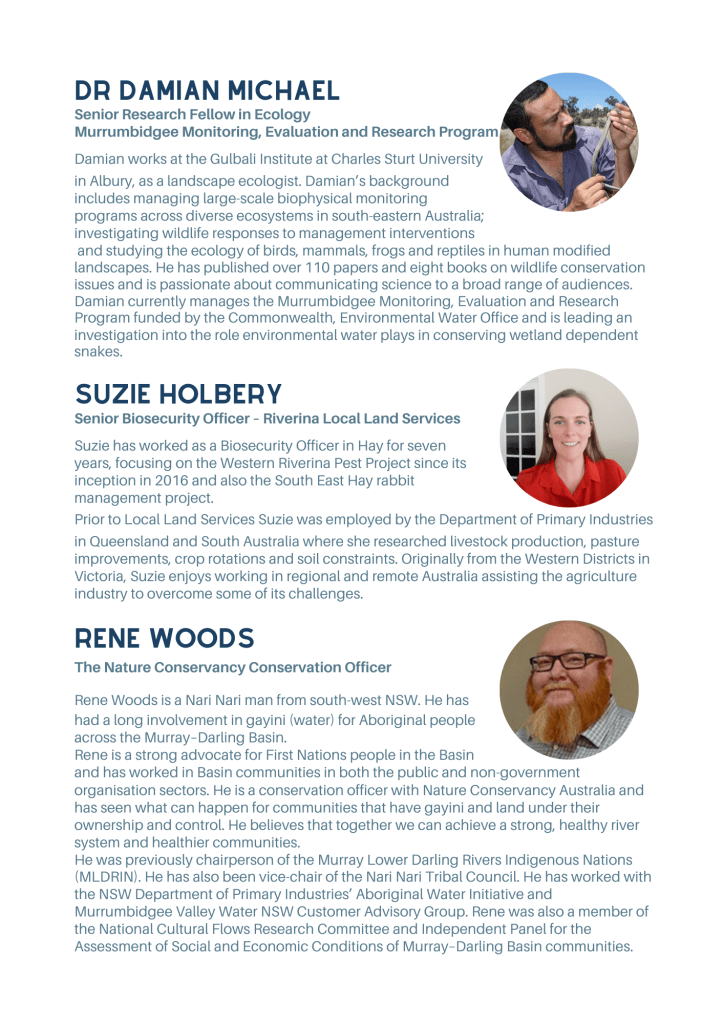 Rene Woods rounded off the afternoon with an explanation of The Nature Conservancy’s work at Gayini and the Great Cumbung Swamp and projects across Australia and the globe.