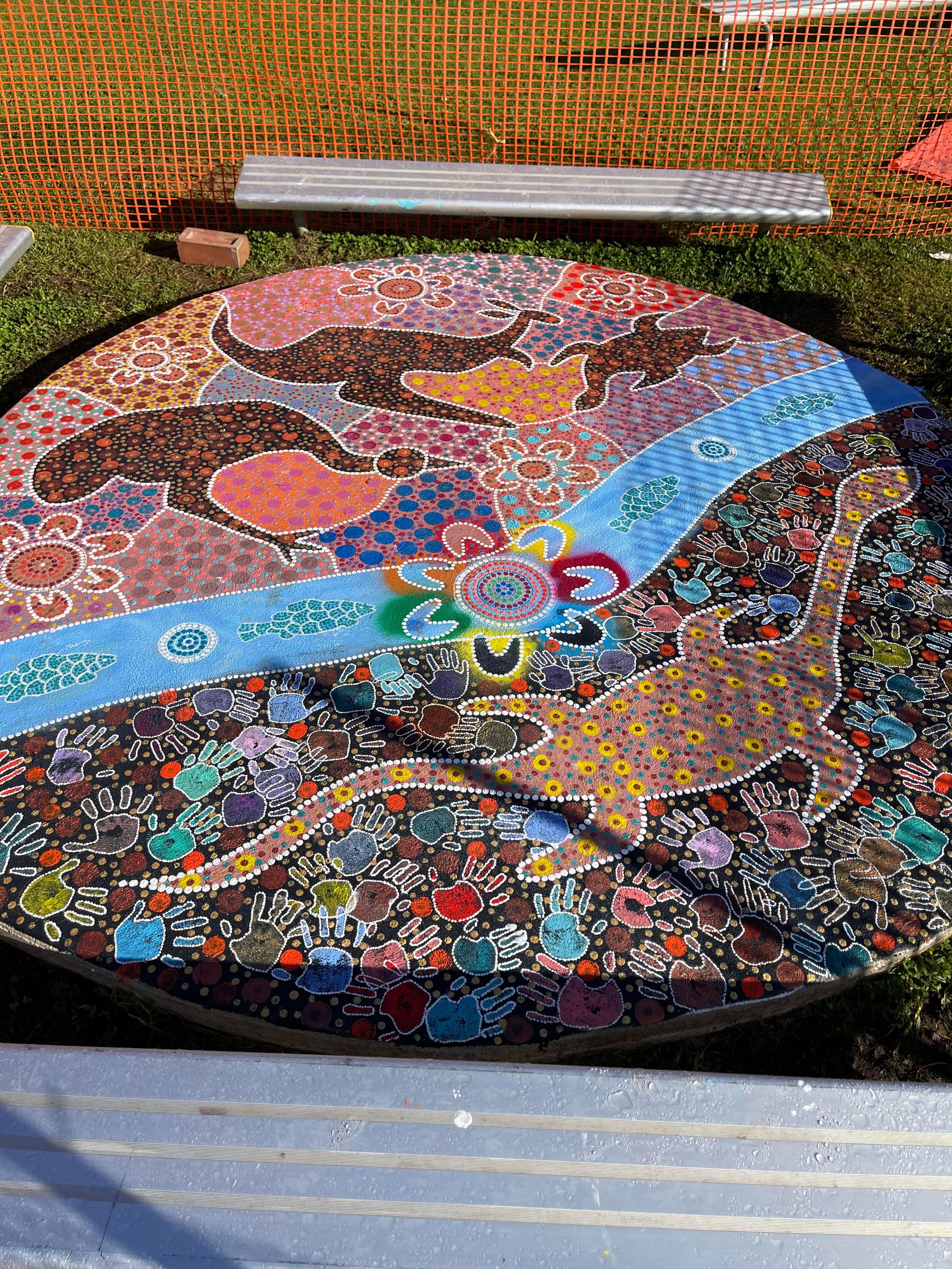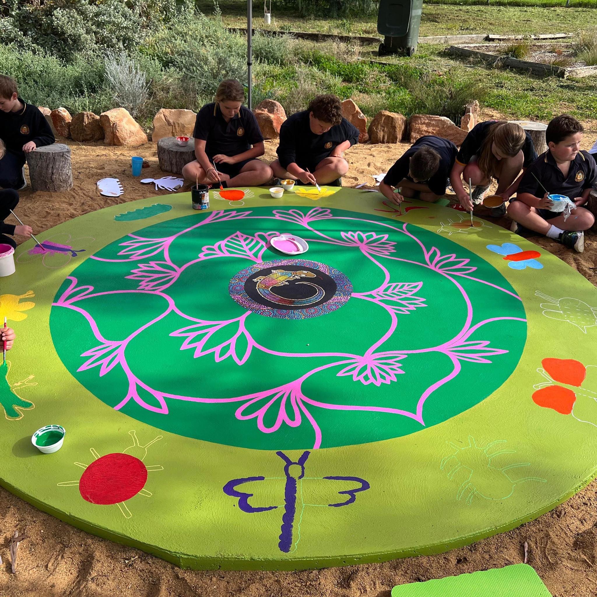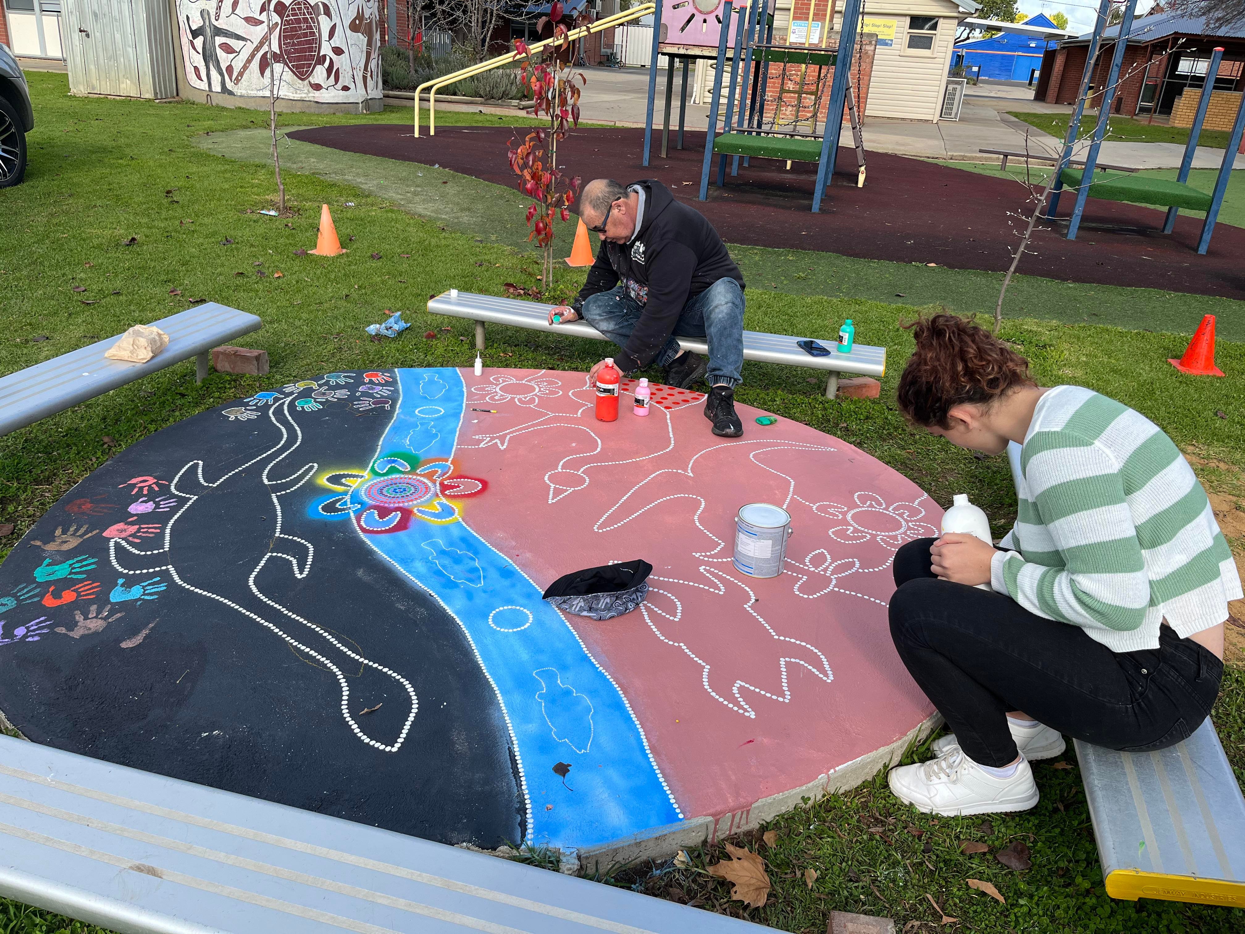 Wiradjuri Artist Owen Lyons spent the week painting a yarning circle with the students. This project has increased awareness, appreciation, and connection to Aboriginal culture and helped establish crucial long-term community connections.